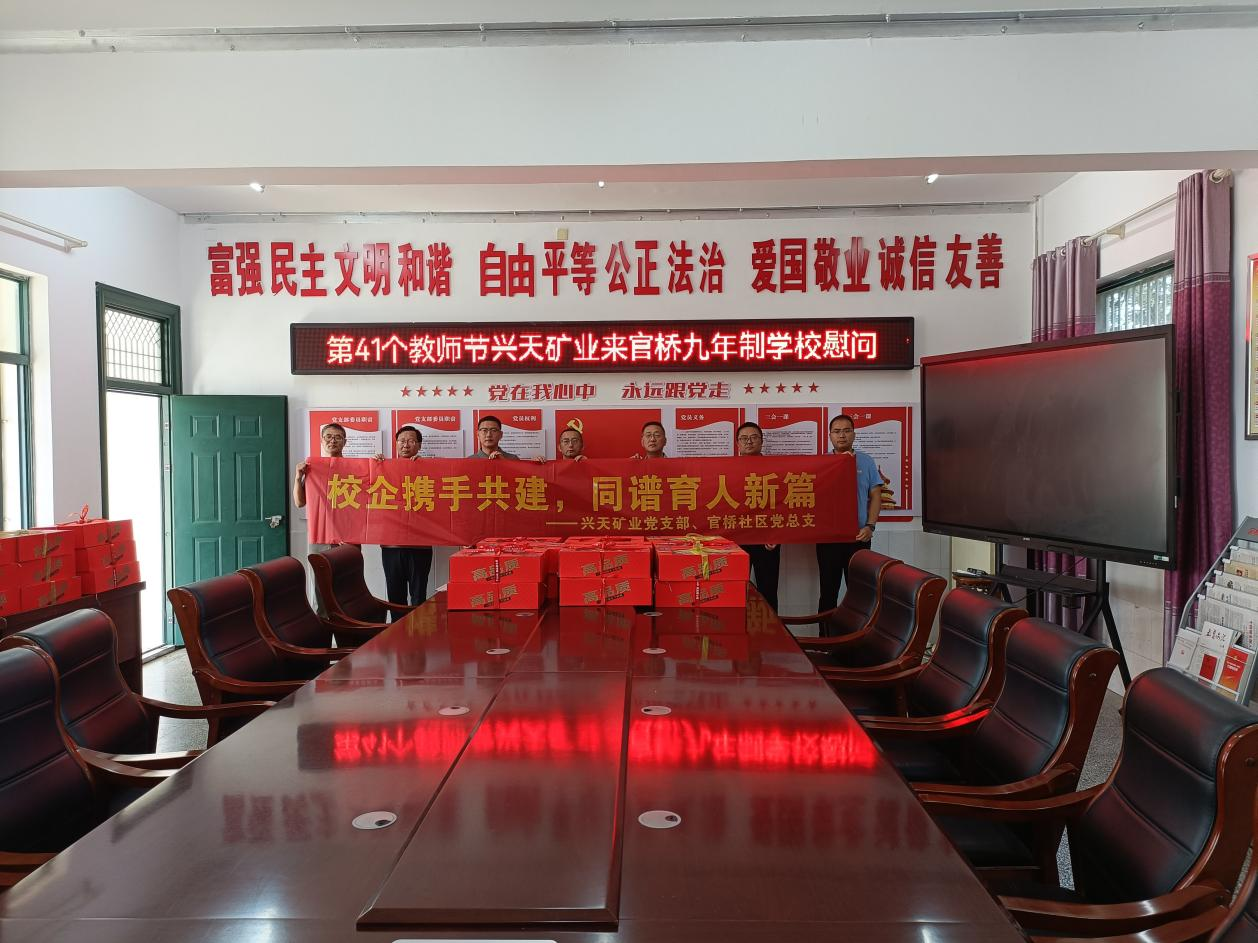 9月10日,興天礦業(yè)黨支部聯(lián)合官橋社區(qū)黨總支前往諭興九年制學(xué)校、官橋九年制學(xué)校,開展教師節(jié)慰問活動,向辛勤耕耘在教育一線的教師們致以節(jié)日問候和崇高敬意。