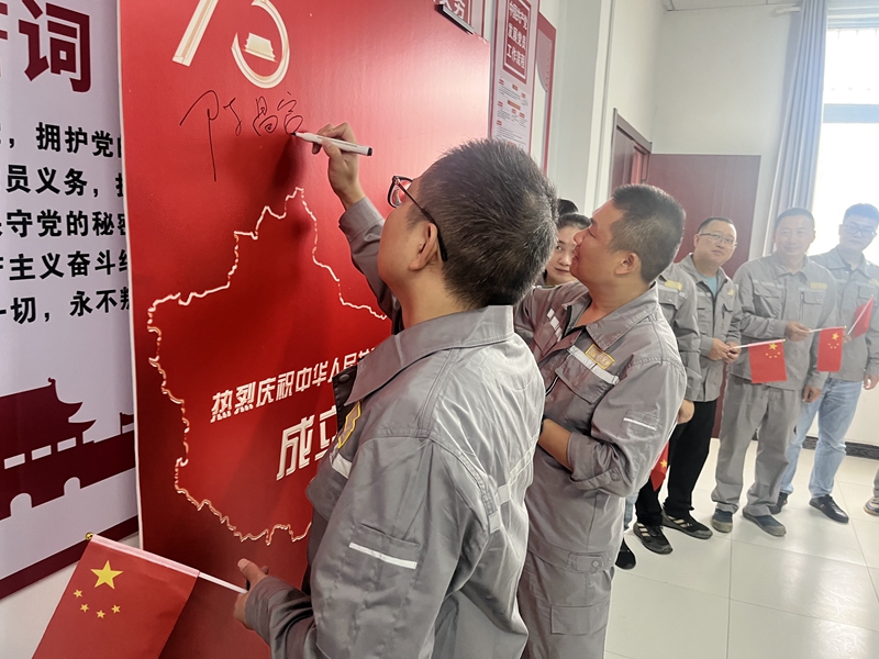在公司黨員活動(dòng)室內(nèi),公司總經(jīng)理陳昌富帶領(lǐng)全體職工合唱歌曲“歌唱祖國(guó)”,全體人員懷著對(duì)黨、對(duì)祖國(guó)的滿腔熱忱在簽到墻上鄭重的簽上自己的名字;公司職工在馬塘湖礦各裝車點(diǎn)、磅房等多處插上了鮮艷的五星紅旗。雄壯嘹亮的歌聲是對(duì)祖國(guó)未來的無限憧憬,整齊有力的簽名是對(duì)祖國(guó)深深的祝福和崇高的敬意,飄揚(yáng)的五星紅旗表達(dá)了對(duì)偉大祖國(guó)真摯的自豪和驕傲。