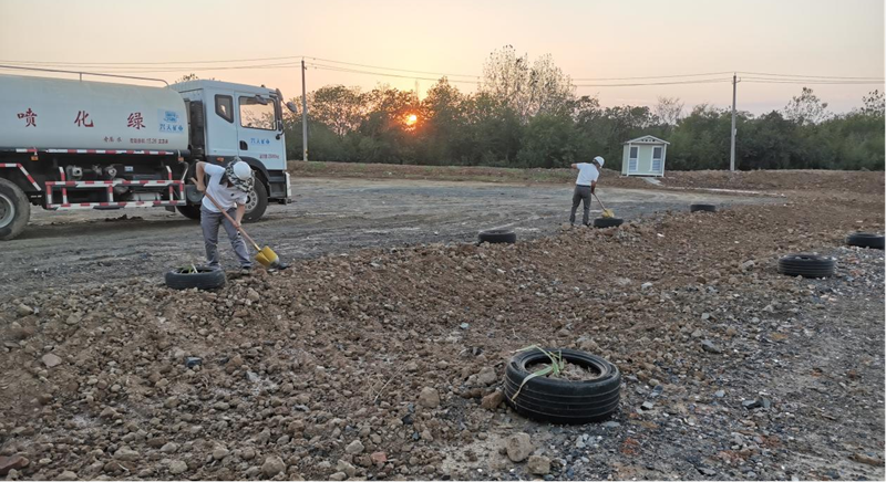 在具備種植條件后,公司陸續(xù)開展移栽樹木、種植花草、澆水養(yǎng)護等工作。經(jīng)過一個多月的努力,原本荒蕪的礦區(qū)已經(jīng)悄然發(fā)生變化,路邊播撒的草種和格?;ǘ家寻l(fā)了芽。放眼望去,一抹抹淡綠色生機盎然。