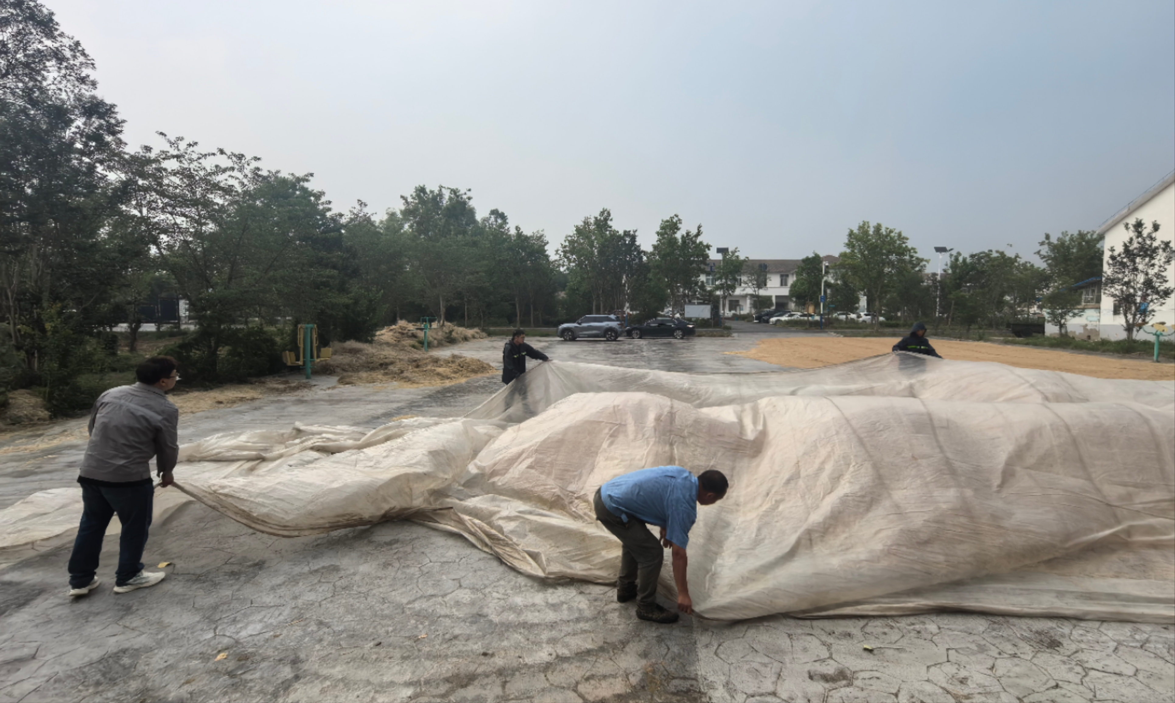 志愿者們拿起推糧鏟、鐵鍬、大掃帚,對糧堆邊緣散落的小麥進(jìn)行集中歸攏,并迅速用防水雨布對糧堆進(jìn)行覆蓋,有效防止因雨水滲透導(dǎo)致的糧食霉變損耗風(fēng)險。